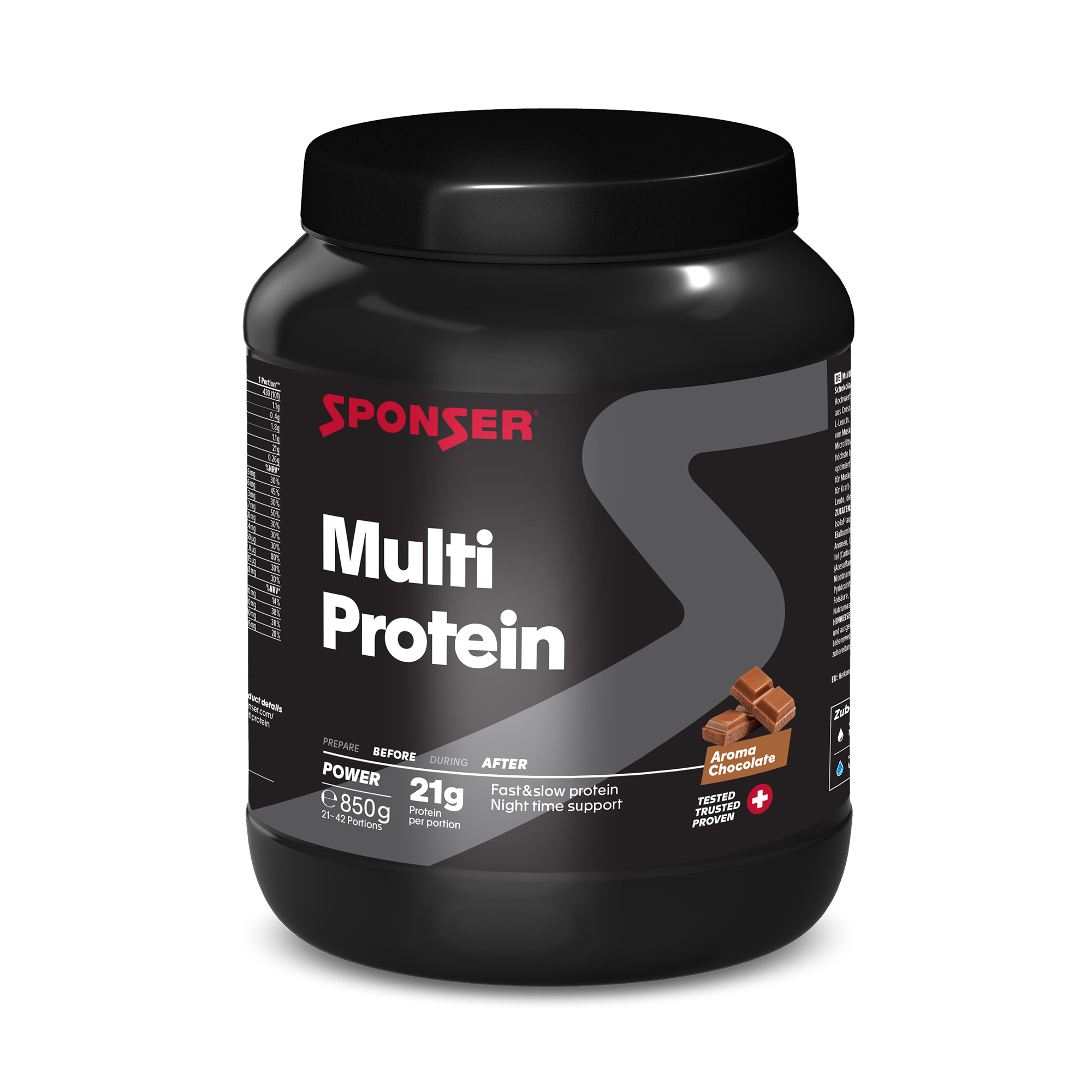 Multi Protein von SPONSER® ist ein Mehrkomponenten Eiweiss, bestehend aus hochwertigem Milchprotein (Engl.: Casein), Molkeprotein (Engl.: Whey) sowie Eialbumin. Durch die spezifische Kombination der verschiedenen Proteinquellen, die sowohl schnell als auch langsam verfügbar sind, ist Multi Protein vielseitigeinsetzbar: Als Basisprotein zum Abdecken des täglichen Proteinbedarfs und für Muskelaufbau und Regeneration nach sportlichen Aktivitäten. Insbesondere durch seine langsamere Verdauung und damit langanhaltende Aminosäurenzufuhr ist Multi Protein aber auch bestens geeignet für den Erhalt von Muskelmasse und als sättigende Mahlzeit (-ergänzung) zur Unterstützung von Diäten.